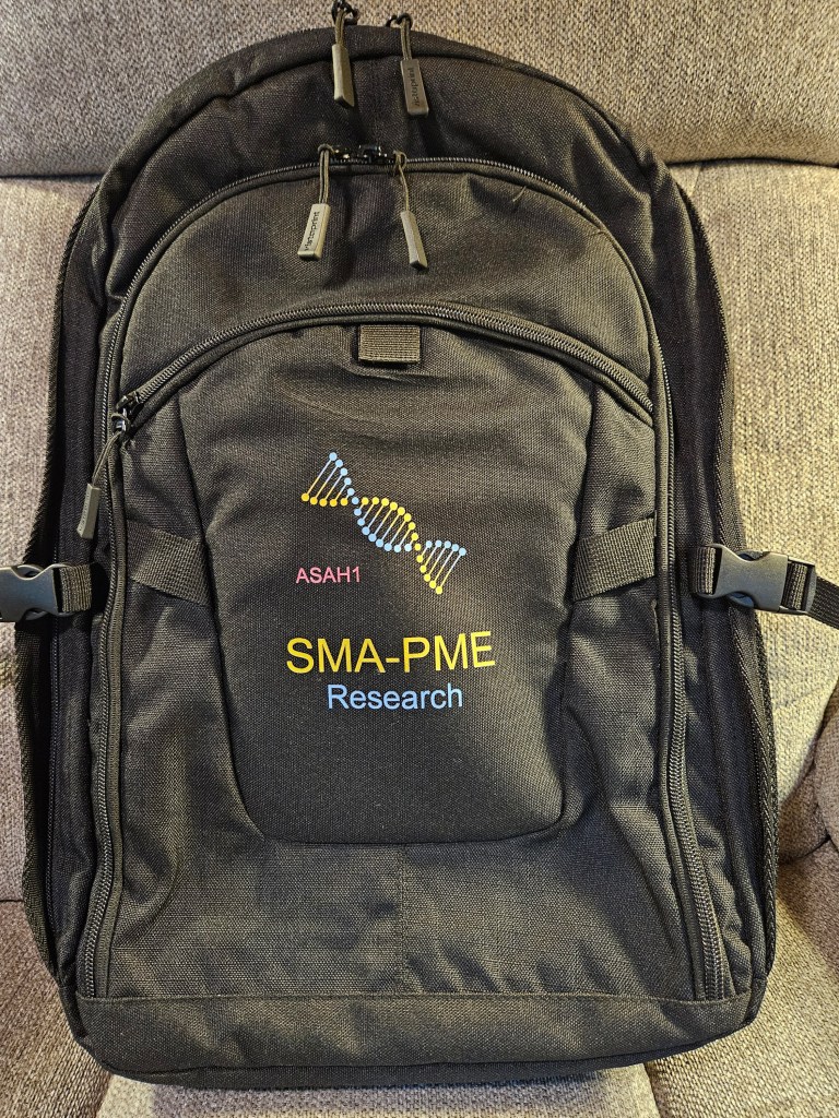 The SMA-PME Research Board of Directors has also approved small gifts of appreciation for larger donors. With a contribution of $500.00 to $999.99 USD, a premium tote depicting the company name and one of the children’s photos will be sent to you. For contributions of $1000.00 USD and over, a quality backpack with adjustable straps will be mailed to you. The backpack measures 18.9″H x 13.4″W x 7.3″L, has a separate 17″ laptop or tablet compartment, two easy-access mesh water bottle compartments, and proudly sports the embroidered SMA-PME Research logo.